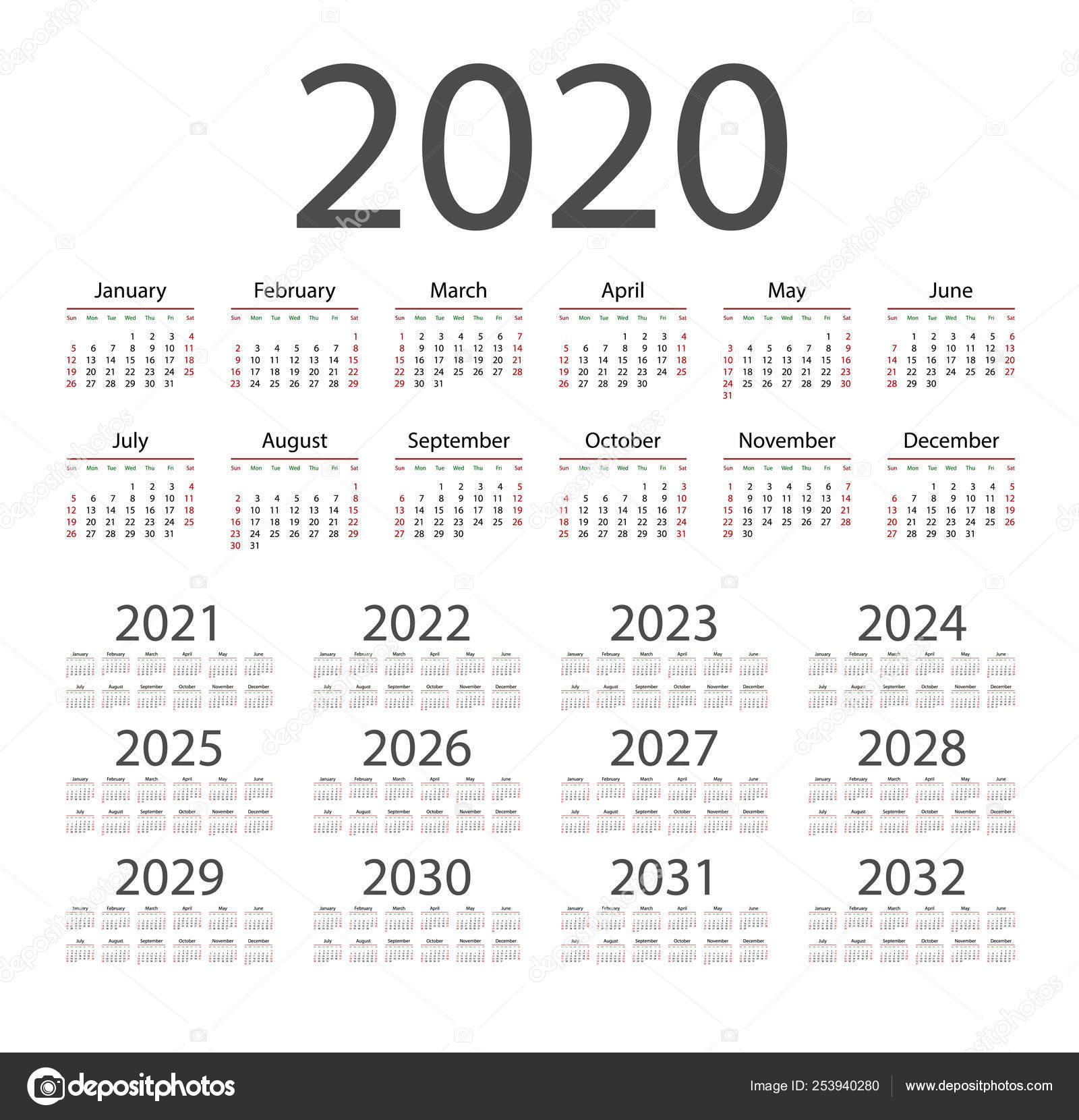 English calendar for years 2020 2032, week starts on Sunday Stock